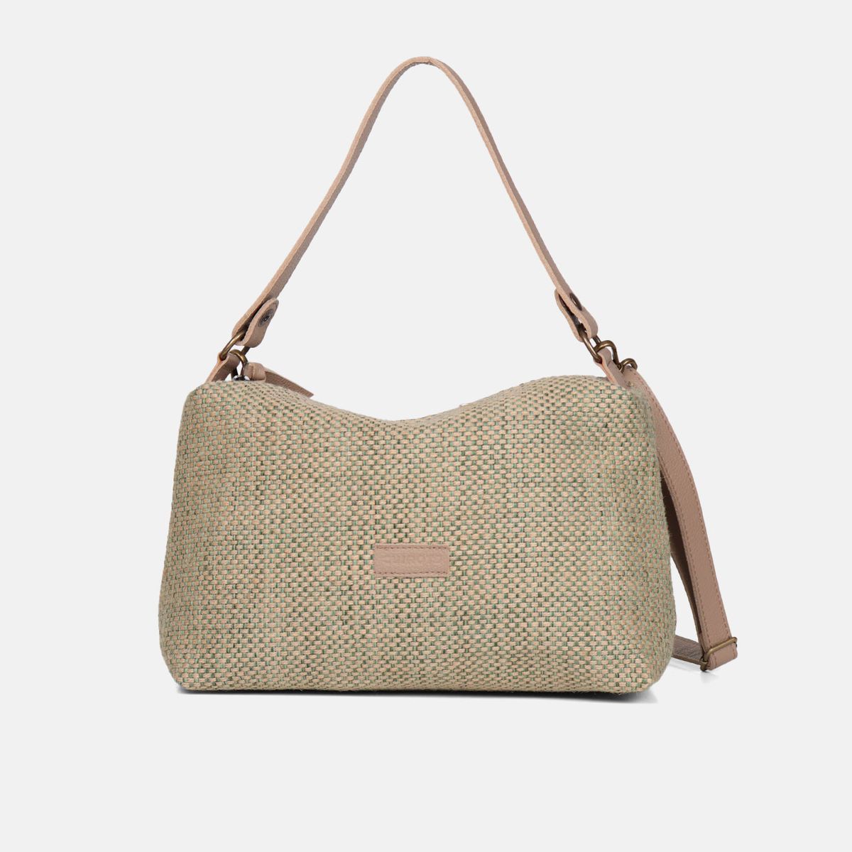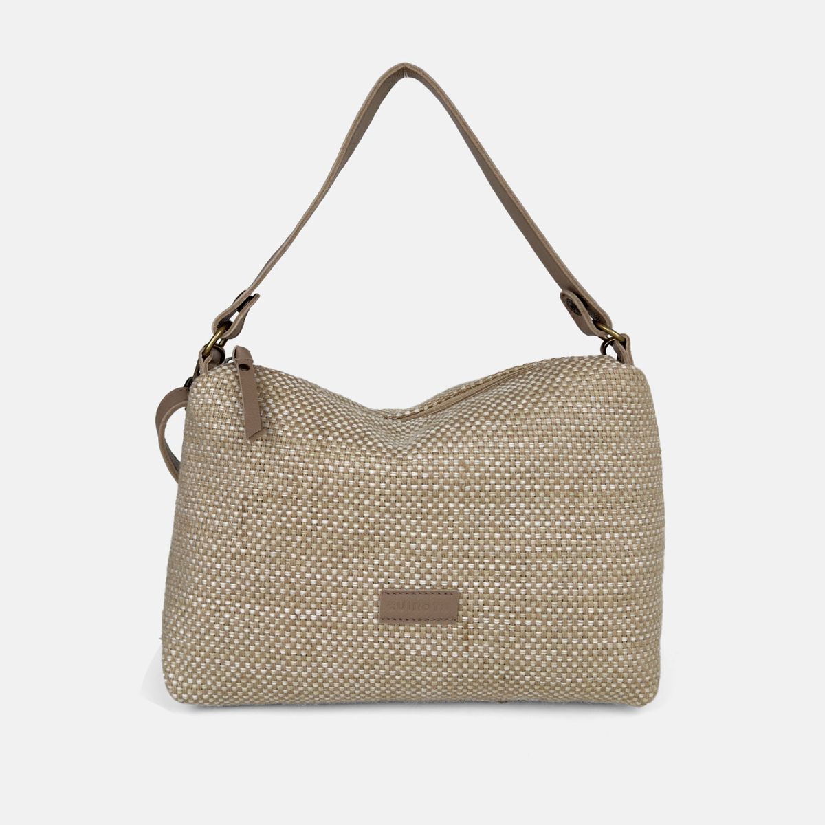 Sac bandoulière de taille moyenne avec une bandoulière longue amovible et réglable permettant de le porter en travers du corps. Fabriqué en jute.